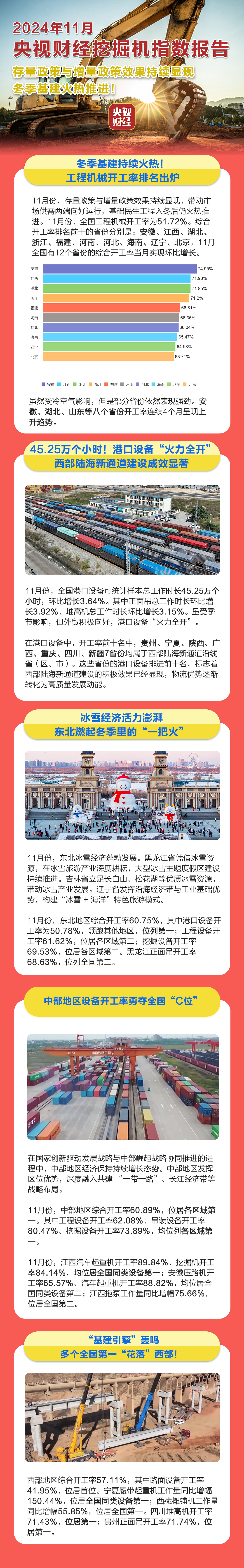 挖掘機(jī)是基礎(chǔ)設(shè)施建設(shè)的“標(biāo)配”,是反映基礎(chǔ)設(shè)施建設(shè)、觀察固定資產(chǎn)投資等經(jīng)濟(jì)變化的風(fēng)向標(biāo)。央視財(cái)經(jīng)與三一重工、樹根互聯(lián)聯(lián)合打造的“央視財(cái)經(jīng)挖掘機(jī)指數(shù)”今天發(fā)布了最新相關(guān)數(shù)據(jù)。11月份,存量政策與增量政策效果持續(xù)顯現(xiàn),帶動(dòng)市場供需兩端向好運(yùn)行,基礎(chǔ)民生工程入冬后仍火熱推進(jìn)。